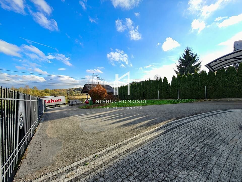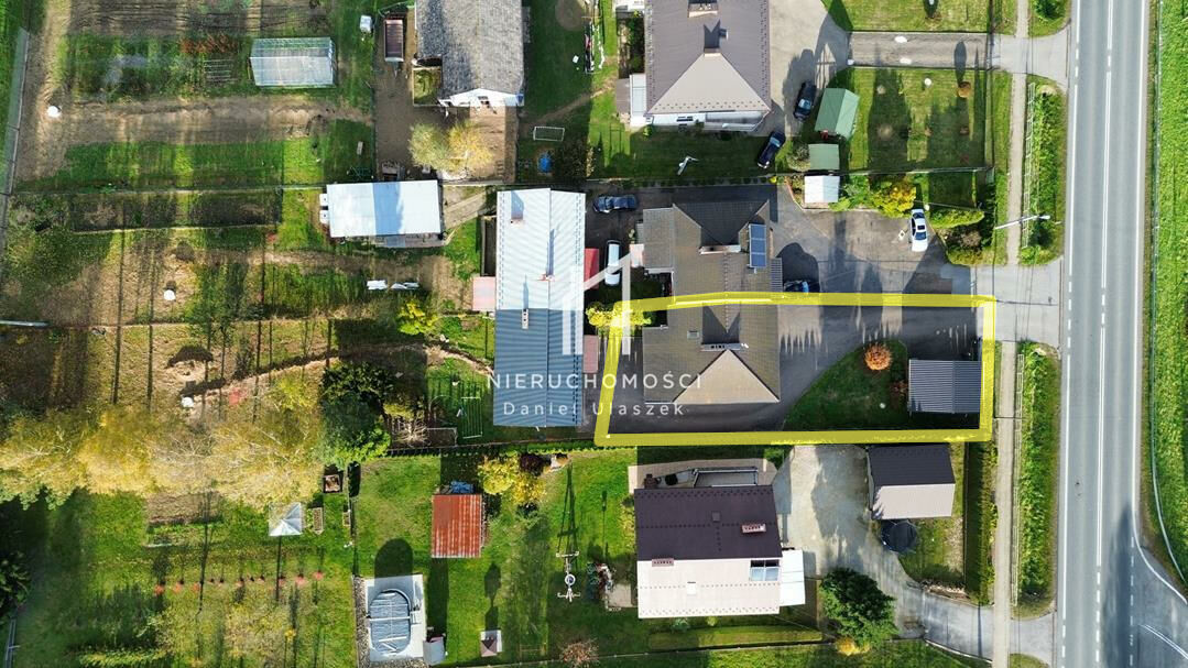 Budynek wzniesiony został na działce o delikatnym spadku terenu i południowo wschodniej ekspozycji. Działka otoczona jest ogrodzeniem z wszystkich stron i wyposażona w szeroką, automatyczną bramę wjazdową. Parcela kształtem zbliżona jest do prostokąta o wymiarach 14m x 40m i powierzchni szacowanej na niespełna 6arów. Na działce znajduje się także drewniana wiata idealna na miejsce postojowe dla dwóch samochodów. Wyasfaltowany podjazd i duży parking przed domem dodatkowo sprzyjać będzie prowadzeniu działalności usługowej w ramach własnego domu.